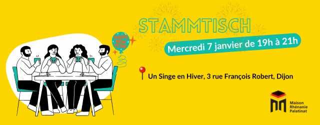 Commencez l'année 2026 avec nous ! Venez au bar dijonnais «Un Singe en Hiver» à notre premier Stammtisch de l’année. Participez à cette soirée pour pratiquer votre allemand dans une ambiance décontractée. Peu importe votre niveau ou votre nationalité ! Découvrez le concept !